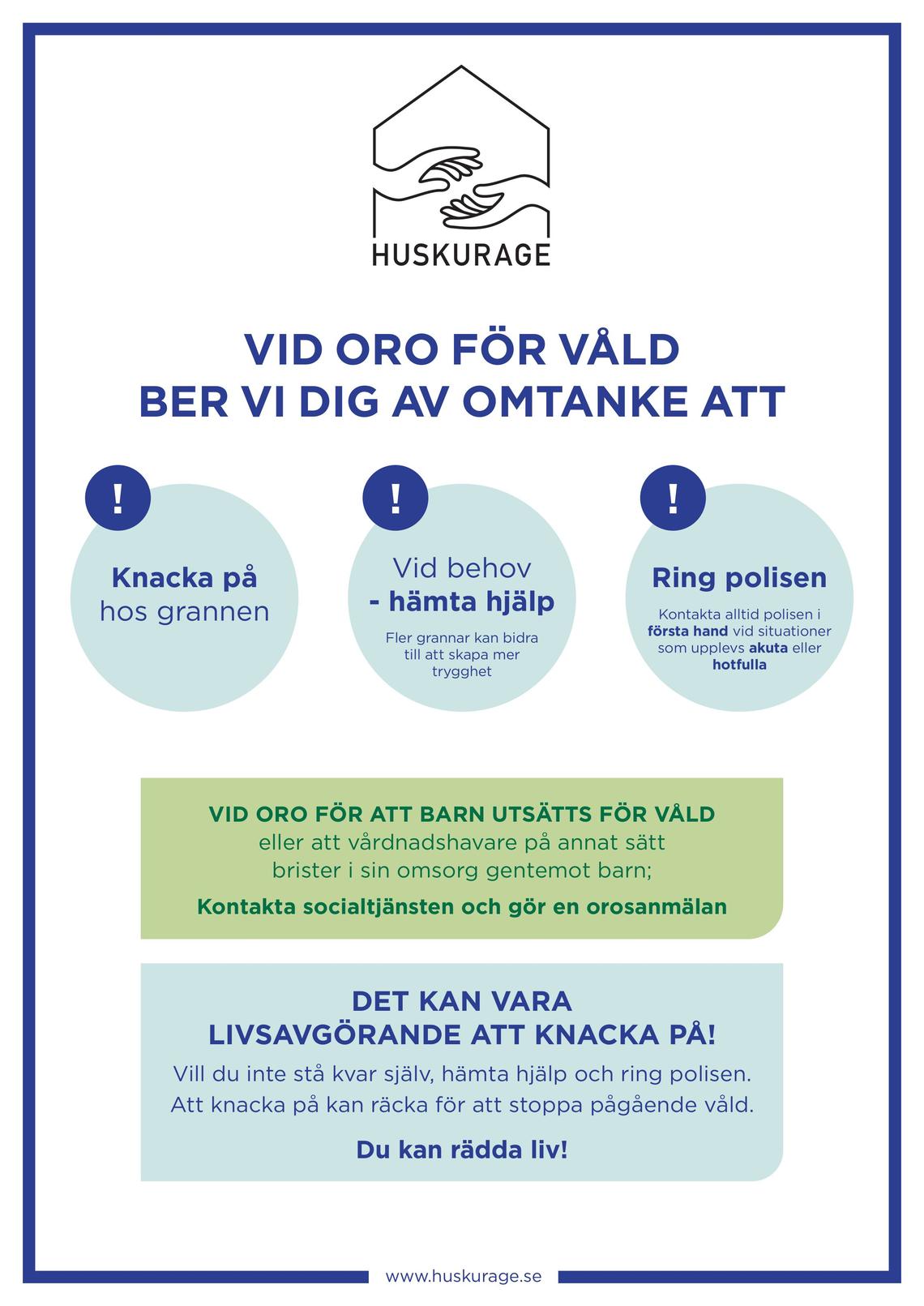 Huskurage som metod tar sikte på att våldet aldrig ska tillåtas ske i det tysta. Det handlar om att ge fler kunskap om våldet och verktyg att agera när oron för att någon utsätts finns där. Tillsammans kan vi skapa tryggare hem och en vardag fri från våld!